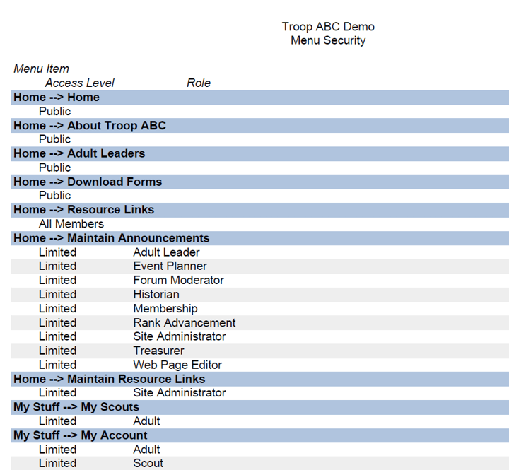 Be generous with security! Make sure that at least two members of the troop are assigned to each role - especially the Site Administrator role. If you only have one site administrator and that person leaves the troop unexpectedly, your troop will be left with no one to manage the site's security.